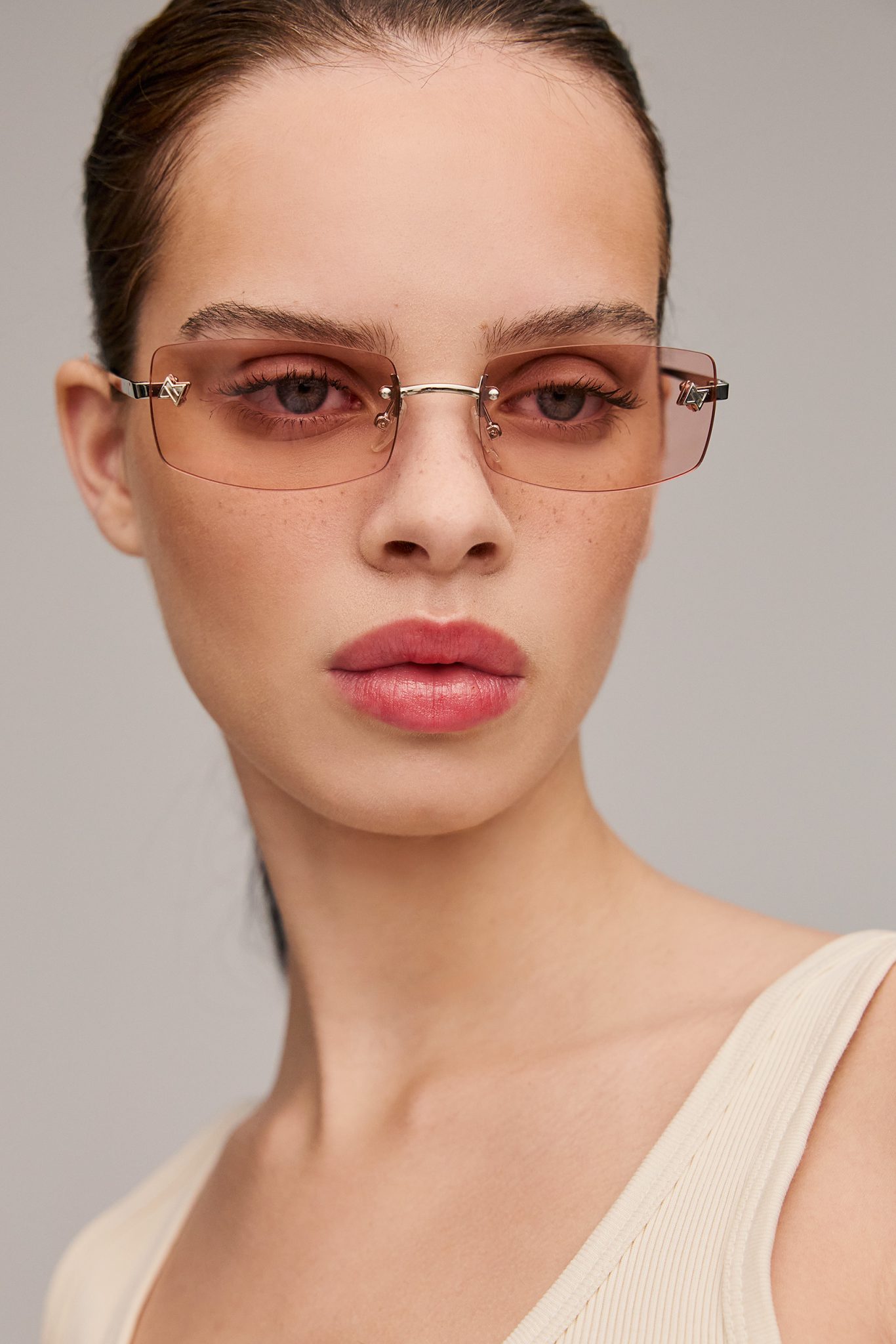 Ultra-slim rectangular sunglasses with rimless lenses ,sleek arms and AV logo detail – a minimalist yet striking piece for elevated everyday looks.