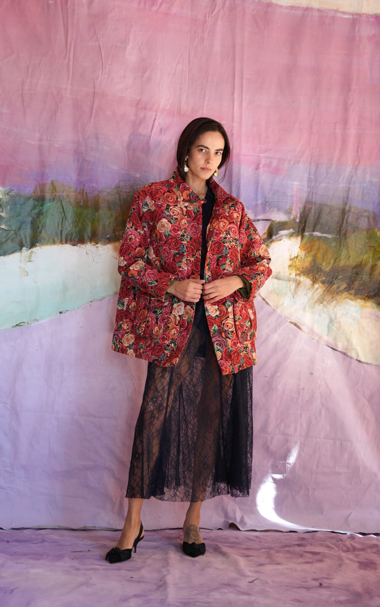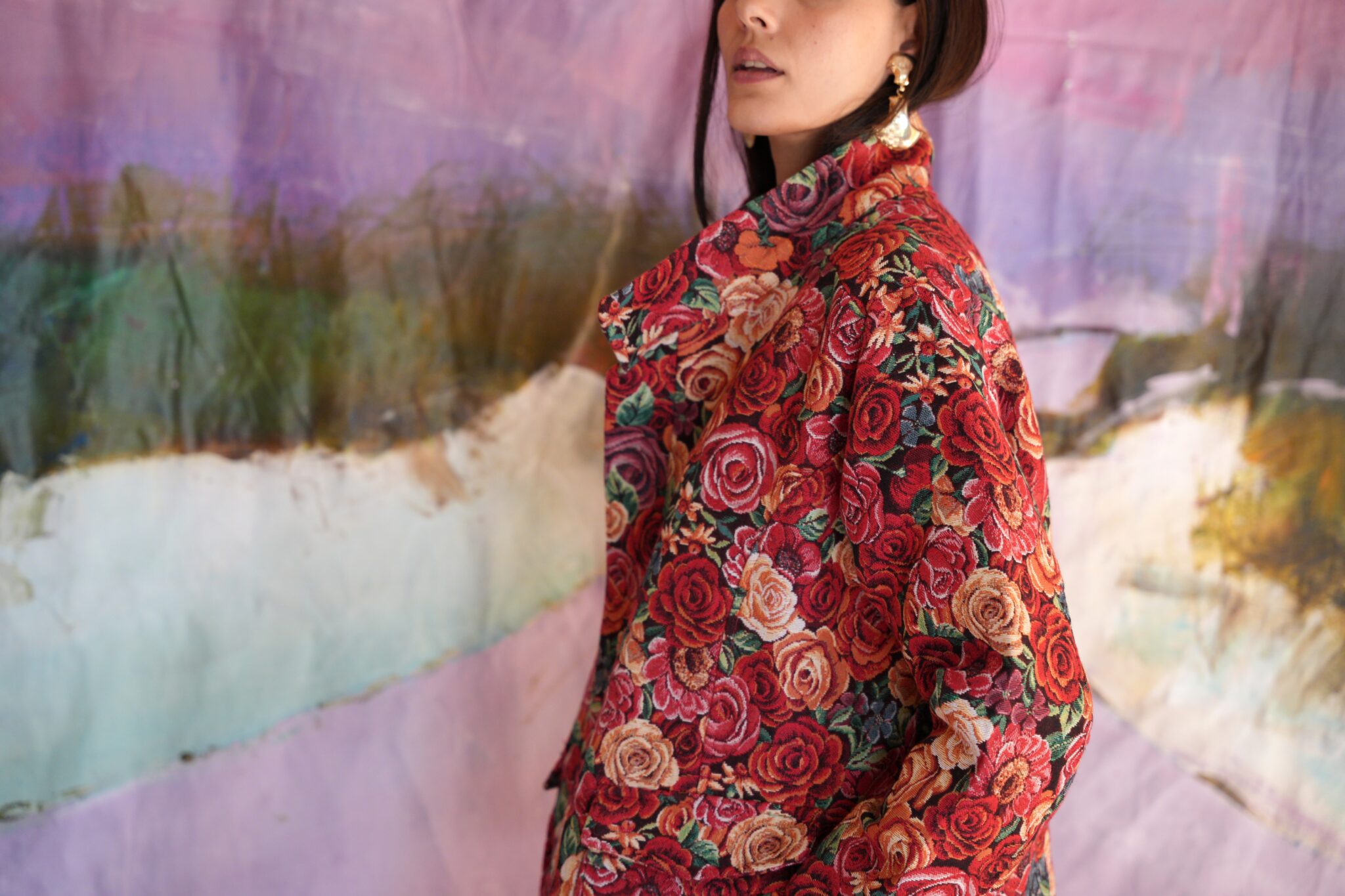 Floral jacket in a comfortable line, with pockets on the sides