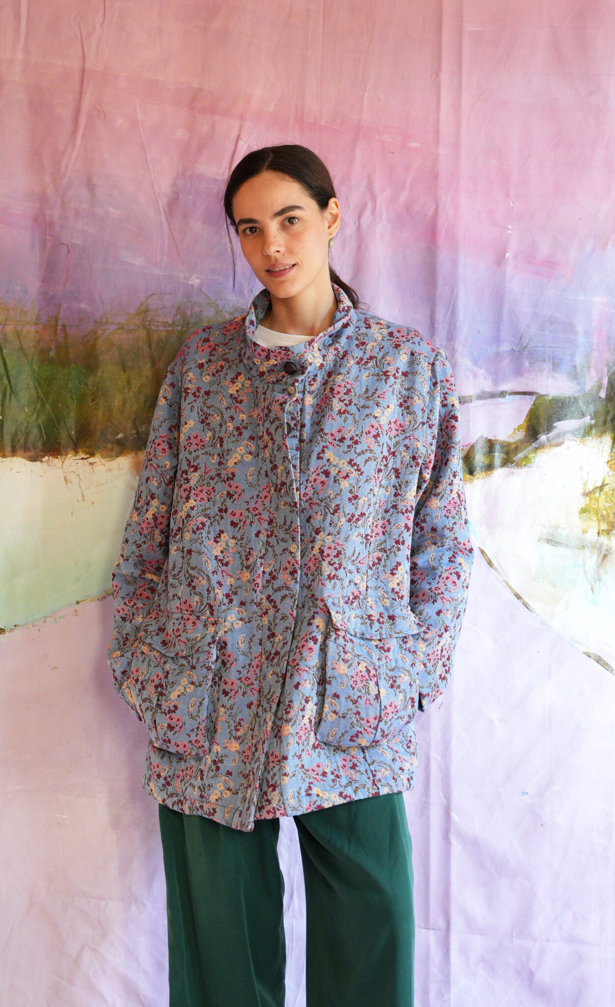 Floral jacket in a comfortable line, with pockets on the sides and a leather button.